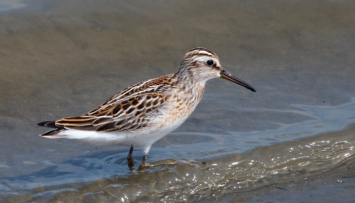 During migration, 1-20 birds can be found on the muddy and boggy shores of