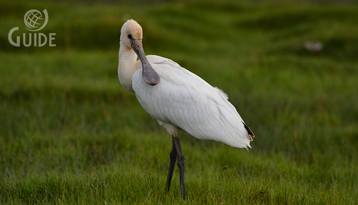 Unmistakable at close range, with long bill with spatula-shaped tip. At