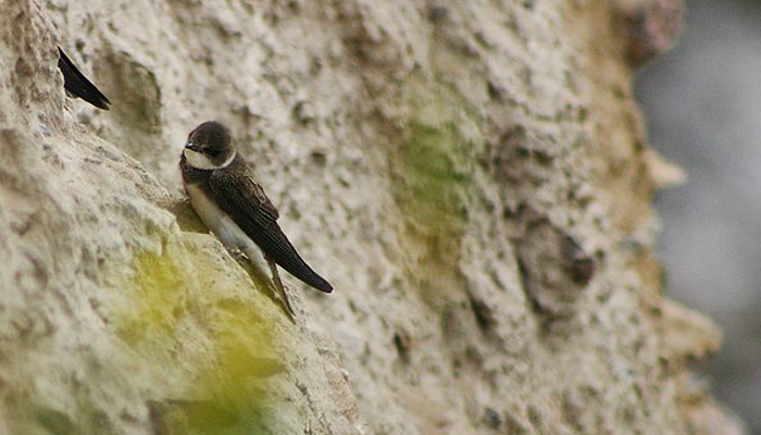 natural quarry or cliffs, in holes of rivers. It is a colonial nester. Nest is