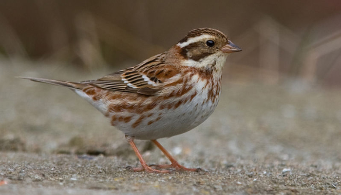 Same size as Reed Bunting. Told by white belly, plain reddish-brown rump,