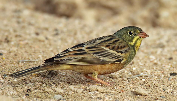 Medium-sized, slim bunting. Bill rather long. Legs and bill buffish-pink,