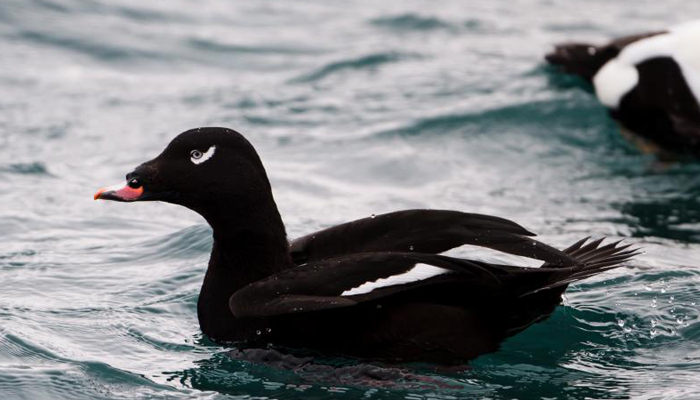 Scoter, which has larger white eye patch, curling up at rear, a black bill knob